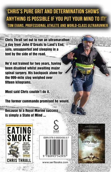 Chris Thrall set out to run an ultramarathon a day from John O'Groats to Land's End, solo, unsupported and sleeping in a tent by the side of the road. He'd not trained for two years, having been disabled whilst awaiting major spinal surgery. His backpack alone for the 999-mile slog Weighed over fifteen kilograms. Most said Chris couldn't do it. The former commando promised he would. Because to a Royal Marine success is simply a State of Mind ...