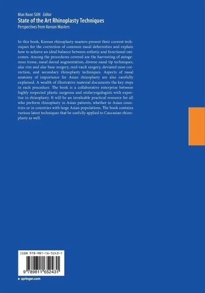 In this book, Korean rhinoplasty masters present their current techniques for the correction of common nasal deformities and explain how to achieve an ideal balance between esthetic and functional outcomes. Among the procedures covered are the harvesting of autogenous tissue, nasal dorsal augmentation, diverse nasal tip techniques, alar rim and alar base surgery, mid-vault surgery, deviated nose correction, and secondary rhinoplasty techniques. Aspects of nasal anatomy of importance for Asian rhinoplasty are also carefully explained. A wealth of illustrative material documents the key steps in each procedure. The book is a collaborative enterprise between highly respected plastic surgeons and otolaryngologists with expertise in rhinoplasty. It will be an invaluable practical resource for all who perform rhinoplasty in Asian patients, whether in Asian countries or in countries with large Asian populations. The book contains various latest techniques that be usefully applied toCaucasian rhinoplasty as well.