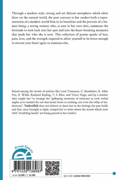 Through a modern style, strong and yet delicate metaphors which often draw on the natural world, the poet conveys to her readers both a representation of a modern world firm in its banalities and the portrait of a human being, a strong woman who, at ease in her own skin, summons the fortitude to look back into her past and into the heart-breaking moments that made her who she is now. This collection of poems speaks of loss, pain, love, and the strength required to allow yourself to be brave enough to entrust your heart again to someone else. Raised among the words of authors like Lord Tennyson, C. Baudelaire, E. Allan Poe, O. Wilde, Rudyard Kipling, T. S. Eliot, and Victor Hugo, and by a mother who taught her "to arrange the "galloping moments of existence at such verbal angles as to remind the ear that music bows to nothing, not even the whip of misfortune", Tmbrr(Sì)i does not believe in dates but in the feelings the past holds and that, once brought to light, compel her to write down the words which now with "trembling hands" are being passed to her readers.