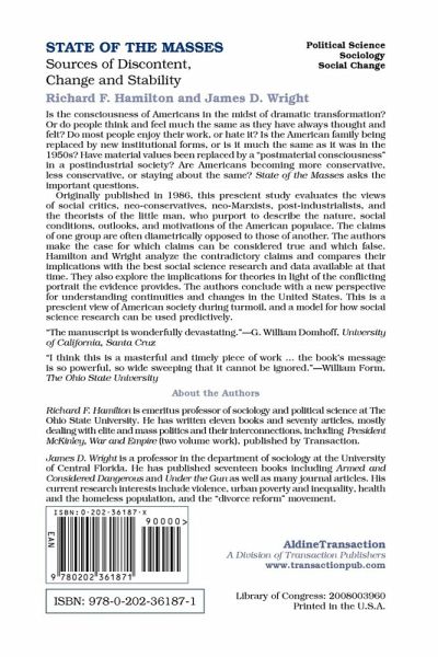Is the consciousness of Americans in the midst of dramatic transformation? Or do people think and feel much the same as they have always thought and felt? Do most people enjoy their work, or hate it? Is the American family being replaced by new institutional forms, or is it much the same as it was in the 1950's? Have material values been replaced by a "postmaterial consciousness" in a postindustrial society? Are Americans becoming more conservative, less conservative, or staying about the same? State of the Masses asks the important questions. Originally published in 1986, this prescient study evaluate the views of social critics, neo-conservatives, neo-Marxists, post-industrialists, and the theorists of the little man, who puport to describe the nature, social conditions, outlooks, and motivations of the American populace. The claims of one group are often diametrically opposed to those of another. The authors make the case for which claims can be considered true and which false. Hamilton and Wright analyze the contradictory claims and compares their implications with the best social science research and data available at that time. They also explore the implications for theories in light of the conflicting portrait the evidence provides. The authors conclude with a new perspective for understanding continuities and changes in the United States. This is a prescient view of American society during turmoil, and a model for how social science research can be used predictively.