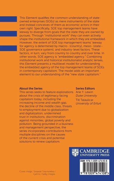 This Element challenges the common understanding of State-Owned Enterprises as state instruments, arguing that they are economic actors. SOE top management teams have agency, influenced by many factors. It presents a multilevel model to understand embedded agency in contemporary capitalism, contributing to the understanding of new state capitalism.