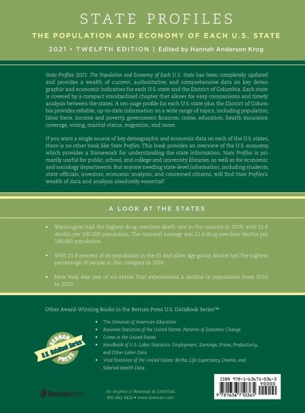 State Profiles 2021: The Population and Economy of Each U.S. State has been completely updated and provides a wealth of current, authoritative, and comprehensive data on key demographic and economic indicators for each U.S. state and the District of Columbia. Each state is covered by a compact standardized chapter that allows for easy comparisons and timely analysis between the states. A ten-page profile for each U.S. state plus the District of Columbia provides reliable, up-to-date information on a wide range of topics, including: population, labor force, income and poverty, government finances, crime, education, health insurance coverage, voting, marital status, migration, and more. If you want a single source of key demographic and economic data on each of the U.S. states, there is no other book like State Profiles. This book provides an overview of the U.S. economy which provides a framework for understanding the state information. State Profiles is primarily useful for public, school, and college and university libraries, as well as for economic and sociology departments. However, anyone needing state-level information including students, state officials, investors, economic analysts, and concerned citizens will find State Profiles wealth of data and analysis absolutely essential!