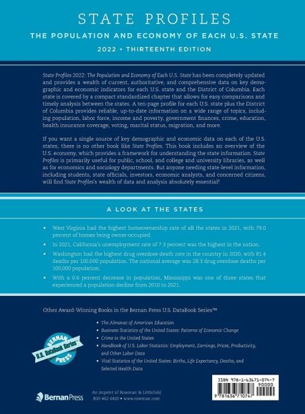 State Profiles 2022: The Population and Economy of Each U.S. State has been completely updated and provides a wealth of current, authoritative, and comprehensive data on key demographic and economic indicators for each U.S. state and the District of Columbia. Each state is covered by a compact standardized chapter that allows for easy comparisons and timely analysis between the states. A ten-page profile for each U.S. state plus the District of Columbia provides reliable, up-to-date information on a wide range of topics, including: population, labor force, income and poverty, government finances, crime, education, health insurance coverage, voting, marital status, migration, and more. If you want a single source of key demographic and economic data on each of the U.S. states, there is no other book like State Profiles. This book provides an overview of the U.S. economy which provides a framework for understanding the state information. State Profiles is primarily useful for public, school, and college and university libraries, as well as for economic and sociology departments. However, anyone needing state-level information including students, state officials, investors, economic analysts, and concerned citizens will find State Profiles wealth of data and analysis absolutely essential!