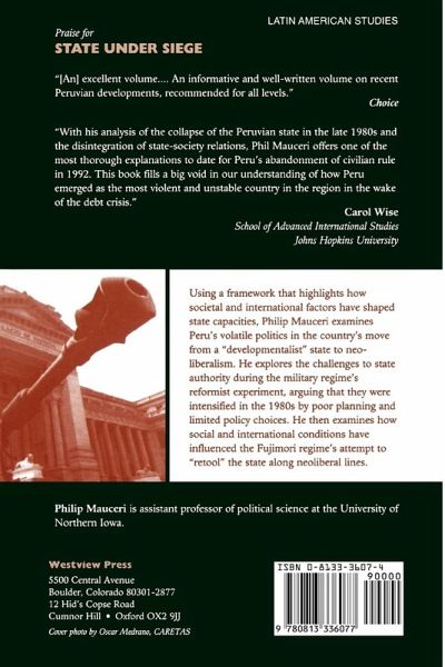 Using a framework that highlights how societal and international factors have shaped state capacities, Philip Mauceri examines the volatile politics in Peru from the Velasco through the Fujimori regimes as the country has moved from a ?developmentalist? state to neoliberalism.Dr. Mauceri begins by reassessing the reformist experiment of the Peruvian military regime (1968?1980), arguing that it led to the development of unexpected challenges to state authority, both from new social actors and international financial organizations. During the 1980s, these challenges intensified, made even worse by poor planning and limited policy choices. The author then argues that the attempt by the Fujimori regime, backed by a neoliberal coalition, to ?retool? the state indicates the degree to which state capacities are determined by social and international conditions. Mauceri also gives special attention to the relation between changing state power and social control. Separate chapters on the evolution of a Lima shantytown and the Shining Path examine how changes in state-society relations have had impacts at the grassroots level.