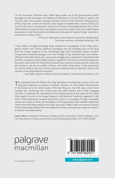 'In this new book, historian Harry Miller again makes use of the gentry/state conflict paradigm he had developed and utilized so effectively in his first book to explore the way the state-versus-gentry interplay became a factor in the decision-making process of the Qing rulers as the new Manchu rulers began to establish their control of China. As was the case with its predecessor, State versus Gentry in Early Qing Dynasty China, 1644-1699 balances strong narrative and analysis to provide a deeper and more sophisticated awareness of what the dramatic and often painful decades of 'regime change' were like in seventeenth-century China.' - Murray A. Rubinstein, Senior Research Associate, Weatherhead East Asian Institute, Columbia University, USA 'Harry Miller's thought-provoking study extends his investigation of the Ming state-gentry conflict over Chinese political sovereignty into the founding years of the Qing from the Dorgon Regency to the mid-Kangxi reign. This beautifully written narrative incorporates translated passages from the writings of key imperial elites and scholar-officials in the midst of this sixty-year power struggle that culminated in the political and symbolic acceptance of the Kangxi Emperor's sagehood. This book is extremely important because it shows that the Ming-Qing transition was a period of great political continuity and synthesis, not one of conflict, violence, and ethnic divide alone. It also shows that the scholar-official class and Chinese political traditions had an important hand in the creation of the Qing imperial enterprise.' - Jane Kate Leonard, Professor Emerita of History, The University of Akron, USA