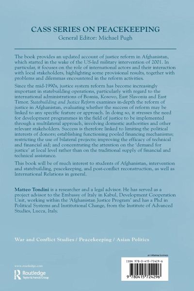 The book provides an updated account of justice reform in Afghanistan, which started in the wake of the US-led military intervention of 2001. In particular, it focuses on the role of international actors and their interaction with local stakeholders, highlighting some provisional results, together with problems and dilemmas encountered in the reform activities. Since the mid-1990s, justice system reform has become increasingly important in state-building operations, particularly with regard to the international administrations of Bosnia, Kosovo, East Slavonia and East Timor. Statebuilding and Justice Reform examines in depth the reform of justice in Afghanistan, evaluating whether the success of reform may be linked to any specific feature or approach. In doing so, it stresses the need for development programmes in the field of justice to be implemented through a multilateral approach, involving domestic authorities and other relevant stakeholders. Success is therefore linked to limiting the political interests of donors; establishing functioning pooled financing mechanisms; restricting the use of bilateral projects; improving the efficacy of technical and financial aid; and concentrating the attention on the 'demand for justice' at local level rather than on the traditional supply of financial and technical assistance. This book will be of much interest to students of Afghanistan, intervention and statebuilding, peacekeeping, and post-conflict reconstruction, as well as International Relations in general. Matteo Tondini is a researcher and a legal advisor. He has served as a project advisor to the Embassy of Italy in Kabul, Development Cooperation Unit, working within the 'Afghanistan Justice Program' and has a Phd in Political Systems and Institutional Change, from the Institute of Advanced Studies, Lucca, Italy.
