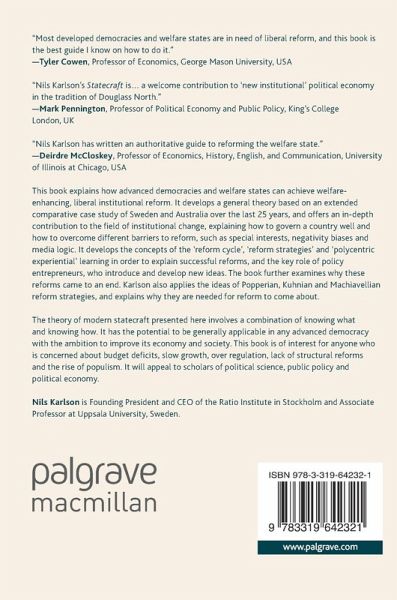 This book explains how advanced democracies and welfare states can achieve welfare-enhancing, liberal institutional reform. It develops a general theory based on an extended comparative case study of Sweden and Australia over the last 25 years, and offers an in-depth contribution to the field of institutional change, explaining how to govern a country well and how to overcome different barriers to reform, such as special interests, negativity biases and media logic. It develops the concepts of the 'reform cycle', 'reform strategies' and 'polycentric experiential' learning in order to explain successful reforms, and the key role of policy entrepreneurs, who introduce and develop new ideas. The book further examines why these reforms came to an end. Karlson also applies the ideas of Popperian, Kuhnian and Machiavellian reform strategies, and explains why they are needed for reform to come about.