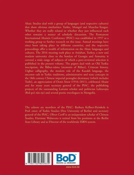 Altaic Studies deal with a group of languages (and respective cultures) that show obvious similarities: Turkic, Mongol and Manchu-Tungus. Whether they are really related or whether they just influenced each other remains a matter of scholarly discussion. The Permanent International Altaistic Conference (PIAC) was established in 1957 as a working group to further research on this issue. Annual meetings have since been taking place in different countries, and the respective proceedings offer a wealth of information on the Altaic languages and cultures. The 2016 meeting took place at Ardahan, Turkey, a new and modern university close to the borders of Georgia and Armenia; it covered a wide range of subjects of which a peer-reviewed selection is published in the present volume. The papers deal with an Old Turkic inscription, the Bâbur-nâma (memoirs of Bâbur), Crimean history, Uighur calligraphy, the modern role of the Kazakh language, the ancestor cult in Turkic traditions, administrative and state concepts in the 18th century Chinese imperial pentaglot dictionary (which includes Turki), an appreciation of Denis Sinor (1916-2011), celebrated Altaist and for many years secretary general of the PIAC, the publishing projects of the outstanding Lamaist scholar and politician Lalitavajra (Rol-pa'i rdo-rje) and several poetic travelogues in Mongolia.The editors are members of the PIAC: Barbara Kellner-Heinkele is Prof. emer. of Turkic Studies (Free University of Berlin) and secretary general of the PIAC, Oliver Corff is an independent scholar of Chinese Studies, Hartmut Walravens is retired from his positions at the Berlin State Library and as Director of the worldwide ISBN system.