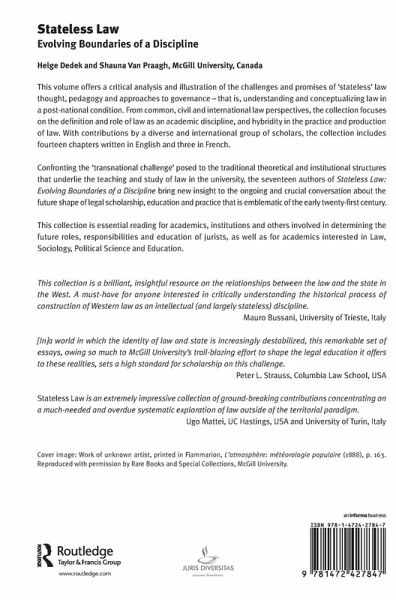 prologue Chapter 1 Stateless Law, Sally EngleMerry Part I Introduction: Situating Stateless Law Chapter 2 Stating Boundaries, HelgeDedek Chapter 3 Teaching Law, Shauna VanPraagh Part II The 'Discipline' of Stateless Law Chapter 4 Back to the Future, Ernest J.Weinrib Chapter 5 Law as an Academic Discipline, HanochDagan Chapter 6 Doctrinal Knowledge, Legal Doctrinal Scholarship and the Problem of Interdisciplinary Engagement, MátyásBódig Chapter 7 The Structure of Stateless Law, MichelleCumyn Part III The Forms and Aspirations of Stateless Law Chapter 8 Brève théorie culturelle du droit, LouisAssier-Andrieu chaptr9 Un-stating Law, MarkAntaki Chapter 10 The Study of Legal Plurality outside 'Legal Pluralism', MaximeSt-Hilaire Chapter 11 Stateless Law, JayeEllis Chapter 12, FrédéricZenati-Castaing Part IV The Practice, Teaching and Learning of Stateless Law Chapter 13 Thinking, Doing, Being, Stephen J.Toope Chapter 14 Qu'est-ce qu'une ' faculté 'de droit? De la philosophie au droit, VincentForray Chapter 15 Everything Old Is New Again, Seán PatrickDonlan Chapter 16 The Impact of 'Stateless Law' on Legal Pedagogy, RosalieJukier epilogue Epilogue Chapter 17 What Lies Before, Behind and Beneath a Case? Five Minutes on Transnational Lawyering and the Consequences for Legal Education, PeerZumbansen