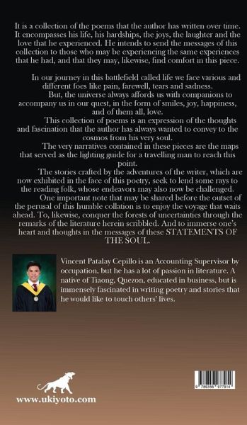 It is a collection of the poems that the author has written over time. It encompasses his life, his hardships, the joys, the laughter and the love that he experienced. He intends to send the messages of this collection to those who may be experiencing the same experiences that he had, and that they may, likewise, find comfort in this piece. In our journey in this battlefield called life we face various and different foes like pain, farewell, tears and sadness. But, the universe always affords us with companions to accompany us in our quest, in the form of smiles, joy, happiness, and of them all, love. This collection of poems is an expression of the thoughts and fascination that the author has always wanted to convey to the cosmos from his very soul. The very narratives contained in these pieces are the maps that served as the lighting guide for a travelling man to reach this point. The stories crafted by the adventures of the writer, which are now exhibited in the face of this poetry, seek to lend some rays to the reading folk, whose endeavors may also now be challenged. One important note that may be shared before the outset of the perusal of this humble collation is to enjoy the voyage that waits ahead. To, likewise, conquer the forests of uncertainties through the remarks of the literature herein scribbled. And to immerse one's heart and thoughts in the messages of these STATEMENTS OF THE SOUL.