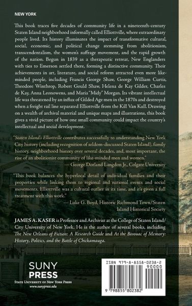 The story of a 19th century Staten Island town that nurtured the careers of nationally significant reformers, abolitionists, and transcendentalists. This book traces five decades of community life in a nineteenth-century Staten Island neighborhood informally called Elliottville, where extraordinary people lived. Its history illuminates the impact of transformative cultural, social, economic, and political change stemming from abolitionism, transcendentalism, the women's suffrage movement, and the rapid growth of the nation. Begun in 1839 as a therapeutic retreat, New Englanders with ties to Emerson settled there, forming a distinctive community. Their achievements in art, literature, and social reform attracted even more like-minded people, including Francis George Shaw, George William Curtis, Theodore Winthrop, Robert Gould Shaw, Helena de Kay Gilder, Charles de Kay, Anna Leonowens, and Maria "Midy" Morgan. Its vibrant intellectual life was threatened by an influx of Gilded Age men in the 1870s and destroyed when a freight rail line separated Elliottville from the Kill Van Kull. Drawing on a wealth of archival material and unique maps and illustrations, this book gives a vivid picture of how one small community could impact the country's intellectual and social development.