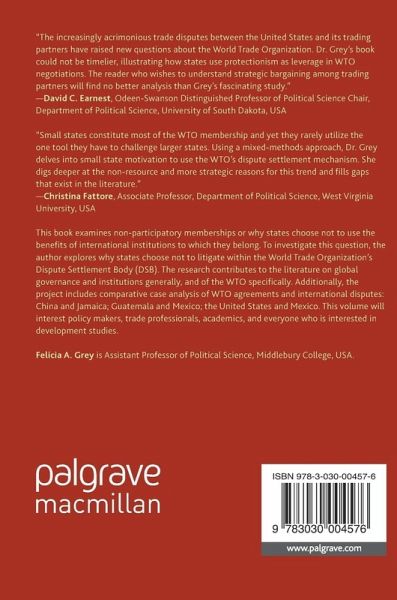This book examines non-participatory memberships or why states choose not to use the benefits of international institutions to which they belong. To investigate this question, the author explores why states choose not to litigate within the World Trade Organization's Dispute Settlement Body (DSB). The research contributes to the literature on global governance and institutions generally, and of the WTO specifically. Additionally, the project includes comparative case analysis of WTO agreements and international disputes: China and Jamaica; Guatemala and Mexico; the United States and Mexico. This volume will interest policy makers, trade professionals, academics, and everyone who is interested in development studies.