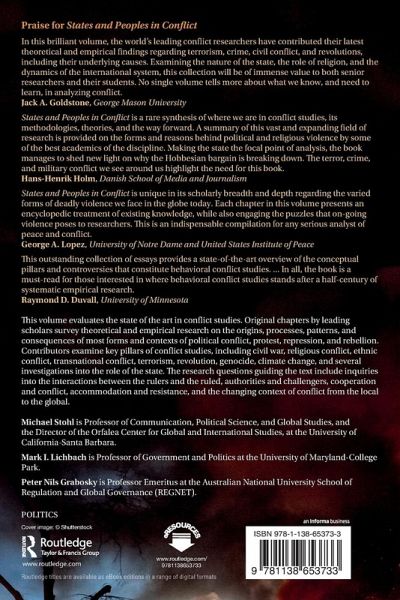 Introduction 1. States and Peoples in Conflict: Pillars, Forms and Transformations in Conflict Studies Peter Grabosky, Mark Lichbach, and Michael Stohl Part I: Pillars of Conflict 2. Grievance: The Nexus between Grievances and Conflict Victor Asal and Kathleen Deloughery 3. Liberalism: The Role of Modern Liberalism Mark I. Lichbach 4. Religion: Influences on Demoestic and International Relations Jonathan Fox 5. Political Authority: Assessing the State of the "State" in Recent Cross-National Empirical Research Keith Jaggers 6. Dynamics and Processes: Linkages between Internal and External Conflict Harvey Starr and Marc V. Simon 7. Climate Change? Reviewing the Evidence Ole Magnus Theisen, Nils Petter Gleditsch, and Halvard Buhaug 8. Comparative and Historical Studies of Crime: Trends, Patterns, Contexts Peter Nils Grabosky Part II: Forms of Conflict 9. Terrorism: Situations, Structure, and Dispositions as an Analytical Framework for Studying Terrorism Scott Englund and Michael Stohl 10. Revolutions: Robust Findings, Persistent Problems, and Promising Frontiers Colin J. Beck 11. State Failure: The Problem of Complex Societal-Systems Monty G. Marshall and Benjamin R. Cole 12. Genocide and Political Mass Murder: Definitions, Theories, Analyses Barbara Harff 13. Transnational Conflict: Normative Struggles and Globalization: The Case of Indigenous Peoples in Bolivia and Ecuador Pamela Martin and Franke Wilmer 14. Wars, Civil Wars, and Armed Conflict: Patterns, Trends, and Analytic Paradigms Peter Wallensteen Conclusion 15. The Future of Conflict Studies Ted Robert Gurr