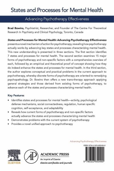 States and Processes for Mental Health: Advancing Psychotherapy Effectiveness presents a novel mechanism of action for psychotherapy, revealing how psychotherapy actually works by advancing key states and processes characterizing mental health. This new understanding is presented in three sections. The first section identifies 7 states and processes for mental health. The second section examines 15 major forms of psychotherapy and non-specific factors with a comprehensive overview of each, followed by an empirical and theoretical proof of concept showing how they do indeed enhance the states and processes for mental health. In the third section, the author explores conceptual and practical problems in the current approach to psychotherapy, whereby discrete forms of psychotherapy are oriented to remedying psychopathology. Dr. Bowins then offers a new trans-therapy approach applying general strategies and those derived from existing forms of psychotherapy, to advance each of the states and processes characterizing mental health.