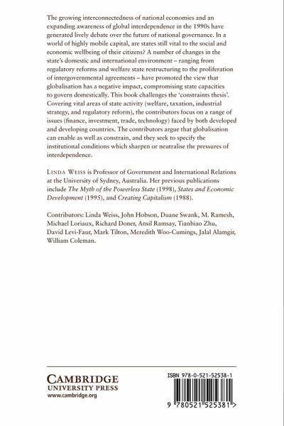 The growing interconnectedness of national economies and an expanding awareness of global interdependence in the 1990s have generated lively debate over the future of national governance. In a world of mobile capital, are states vital to the social and economic wellbeing of their citizens? A number of changes in the state's domestic and international environment - ranging from regulatory reforms and welfare state restructuring to the proliferation of intergovernmental agreements - have promoted the view that globalisation has a negative impact, compromising state capacities to govern domestically. This book challenges the 'constraints thesis'. Covering vital areas of state activity (welfare, taxation, industrial strategy, and regulatory reform), the contributors focus on a range of issues (finance, trade, technology) faced by both developed and developing countries. The contributors argue that globalisation can enable as well as constrain, and they seek to specify the institutional conditions which sharpen or neutralise the pressures of interdependence.