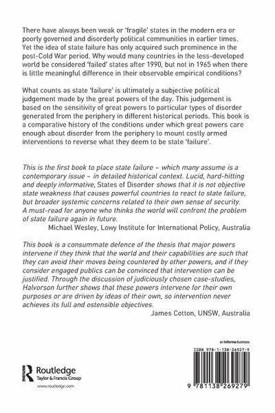 There have always been weak or 'fragile' states in the modern era or poorly governed and disorderly political communities in earlier times. Yet the idea of state failure has only acquired such prominence in the post-Cold War period. Why would many countries in the less-developed world be considered 'failed' states after 1990, but not in 1965 when there is little meaningful difference in their observable empirical conditions? What counts as state 'failure' is ultimately a subjective political judgement made by the great powers of the day. This judgement is based on the sensitivity of great powers to particular types of disorder generated from the periphery in different historical periods. This book is a comparative history of the conditions under which great powers care enough about disorder from the periphery to mount costly armed interventions to reverse what they deem to be state 'failure'.