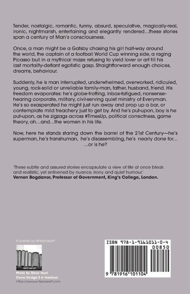Tender, nostalgic, romantic, funny, absurd, magically real, speculative, ironic, nightmarish, entertaining and elegantly rendered…these stories span a century of Man's consciousness. Once, a man might be a Gatsby chasing his girl half-way around the world, the captain of a football World Cup winning side, a raging Picasso bull in a mythical maze refusing to yield lover or art till his last mortality-defiant egotistic gasp. Straightforward enough choices, dreams, behaviour. Suddenly he is man interrupted, underwhelmed, overworked, ridiculed, young, rock-solid or unreliable family man, father, husband, friend; his freedom evaporates: he's globe-trotting inbox-fatigued nonsense-hearing corporate, military civil-serving quiet ministry of Everyman. He's so exasperated he might just run away and prop up a bar, or contemplate mild treachery just to get by, and he's put-upon, boy is he put upon, as he zigzags over #TimesUp, political correctness, game theory, oh… and… the women in his life. Now here he stands staring down the barrel of the 21st Century - he's superman, he's transhuman, he's disassembling, he's nearly done for …or is he?
