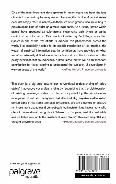"One of the most important developments in recent years has been the loss of control over territory by many states. However, the decline of central states does not simply result in anarchy as there are often groups who are willing to provide some kind of order on a more local basis. As a result, "states within states" have appeared as sub-national movements gain whole or partial control of part of a nation. This new book edited by Paul Kingston and Ian Spears is one of the first efforts to examine this phenomenon across the world. It is especially notable for its explicit theorization of the problem, the wealth of empirical information that the contributors have provided on what are often extremely difficult cases to understand, and the importance of the policy questions that are examined. States Within States will be an important contribution for those seeking to understand the evolution of sovereignty in war-torn areas of the world." - Jeffrey Herbst, Princeton University