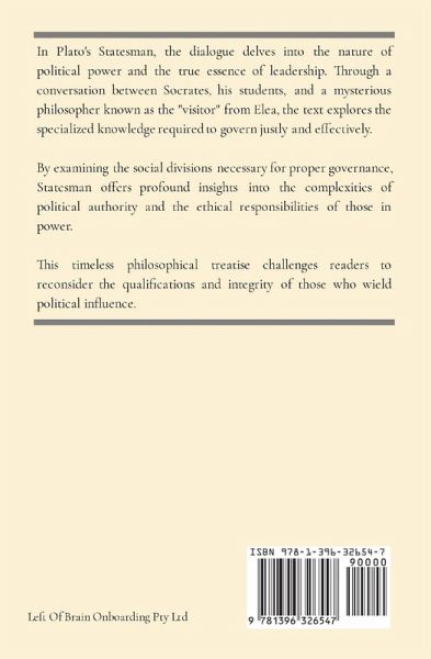 In Plato's Statesman, the dialogue delves into the nature of political power and the true essence of leadership. Through a conversation between Socrates, his students, and a mysterious philosopher known as the "visitor" from Elea, the text explores the specialized knowledge required to govern justly and effectively. By examining the social divisions necessary for proper governance, Statesman offers profound insights into the complexities of political authority and the ethical responsibilities of those in power. This timeless philosophical treatise challenges readers to reconsider the qualifications and integrity of those who wield political influence.