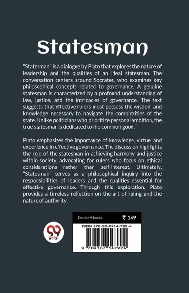 ""Statesman"" is a dialogue by Plato that explores the nature of leadership and the qualities of an ideal statesman. The conversation centers around Socrates, who examines key philosophical concepts related to governance. A genuine statesman is characterized by a profound understanding of law, justice, and the intricacies of governance. The text suggests that effective rulers must possess the wisdom and knowledge necessary to navigate the complexities of the state. Unlike politicians who prioritize personal ambition, the true statesman is dedicated to the common good. Plato emphasizes the importance of knowledge, virtue, and experience in effective governance. The discussion highlights the role of the statesman in achieving harmony and justice within society, advocating for rulers who focus on ethical considerations rather than self-interest. Ultimately, ""Statesman"" serves as a philosophical inquiry into the responsibilities of leaders and the qualities essential for effective governance. Through this exploration, Plato provides a timeless reflection on the art of ruling and the nature of authority.