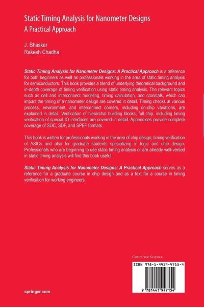 iming, timing, timing! That is the main concern of a digital designer charged with designing a semiconductor chip. What is it, how is it T described, and how does one verify it? The design team of a large digital design may spend months architecting and iterating the design to achieve the required timing target. Besides functional verification, the t- ing closure is the major milestone which dictates when a chip can be - leased to the semiconductor foundry for fabrication. This book addresses the timing verification using static timing analysis for nanometer designs. The book has originated from many years of our working in the area of timing verification for complex nanometer designs. We have come across many design engineers trying to learn the background and various aspects of static timing analysis. Unfortunately, there is no book currently ava- able that can be used by a working engineer to get acquainted with the - tails of static timing analysis. The chip designers lack a central reference for information on timing, that covers the basics to the advanced timing veri- cation procedures and techniques.