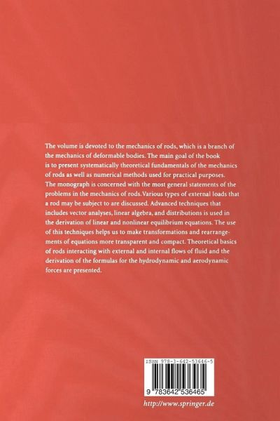 The volume is devoted to mechanics of rods, which is a branch of mechanics of deformable bodies. The main goal of the book is to present systematically theoretical fundamentals of mechanics of rods as well as numerical methods used for practical purposes. The monograph is concerned with the most general statements of the problems in mechanics of rods. Various types of external loads that a rod may be subject to are discussed. Advanced technique that includes vector is used in the derivation of linear analysis, linear algebra, and distributions and nonlinear equilibrium equations. The use of this technique helps us to make transformations and rearrangement of equations more transparent and compact. Theoretical basics of rods interacting with external and internal flows of fluid and the derivation of the formulas for the hydrodynamic and aerody namic forces are presented. The book consists of six chapters and appendices and may be convention ally divided into two parts. That is, Chapters 1 to 3 contain, in the main, theoretical material, whereas Chapters 4 to6 illustrate the application of the theoretical results to problems of practical interest. Problems for self-study are found in Chapters 1, 3, 4, and 5. The solutions to most of the problems are given in Appendix B. The monograph is addressed to scientists, institutional and industrial re searchers, lecturers, and graduate students.