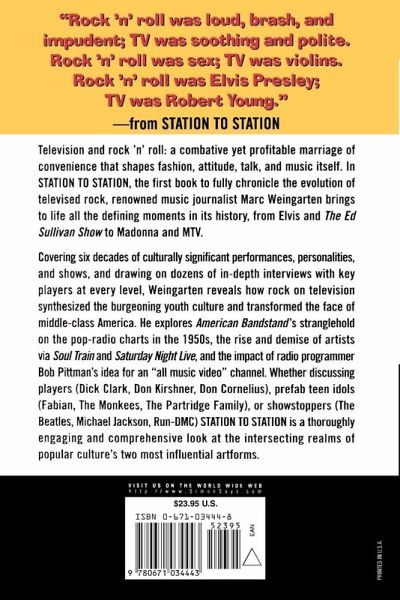 "Rock 'n' roll was loud, brash, and impudent; TV was soothing and polite. Rock 'n' roll was sex; TV was violins. Rock 'n' roll was Elvis Presley; TV was Robert Young." -- from Station to Station Television and rock 'n' roll: a combative yet profitable marriage of convenience that shapes fashion, attitude, talk, and music itself. In Station to Station, the first book to fully chronicle the evolution of televised rock, renowned music journalist Marc Weingarten brings to life all the defining moments in its history, from Elvis and The Ed Sullivan Show to Madonna and MTV. Covering six decades of culturally significant performances, personalities, and shows, and drawing on dozens of in-depth interviews with key players at every level, Weingarten reveals how rock on television synthesized the burgeoning youth culture and transformed the face of middle-class America. He explores American Bandstand's stranglehold on the pop-radio charts in the 1950's, the rise and demise of artists via Soul Train and Saturday Night Live, and the impact of radio programmer Bob Pittman's idea for an "all music video" channel. Whether discussing players (Dick Clark, Don Kirshner, Don Cornelius), prefab teen idols (Fabian, The Monkees, The Partridge Family), or showstoppers (The Beatles, Michael Jackson, Run-DMC) Station to Station is a thouroughly engaging and coprehensive look at the intersecting realms of popular culture's two most influential artforms.