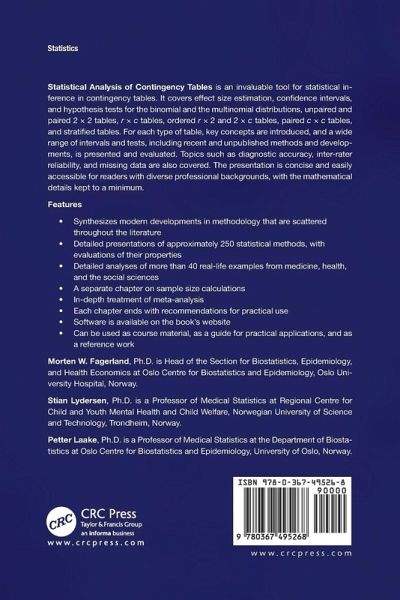 Statistical Analysis of Contingency Tables is an invaluable tool for statistical inference in contingency tables. It covers effect size estimation, confidence intervals, and hypothesis tests for the binomial and the multinomial distributions, unpaired and paired 2x2 tables, rxc tables, ordered rx2 and 2xc tables, paired cxc tables, and stratified tables. For each type of table, key concepts are introduced, and a wide range of intervals and tests, including recent and unpublished methods and developments, are presented and evaluated. Topics such as diagnostic accuracy, inter-rater reliability, and missing data are also covered. The presentation is concise and easily accessible for readers with diverse professional backgrounds, with the mathematical details kept to a minimum.