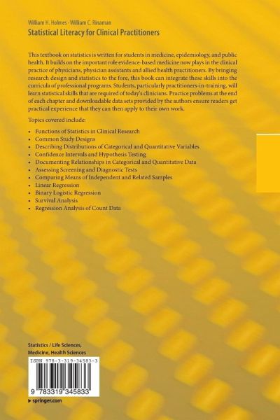 This textbook on statistics is written for students in medicine, epidemiology, and public health. It builds on the important role evidence-based medicine now plays in the clinical practice of physicians, physician assistants and allied health practitioners. By bringing research design and statistics to the fore, this book can integrate these skills into the curricula of professional programs. Students, particularly practitioners-in-training, will learn statistical skills that are required of today's clinicians. Practice problems at the end of each chapter and downloadable data sets provided by the authors ensure readers get practical experience that they can then apply to their own work.