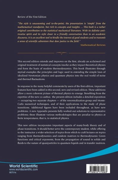 This second edition extends and improves on the first, already an acclaimed and original treatment of statistical concepts insofar as they impact theoretical physics and form the basis of modern thermodynamics. This book illustrates through myriad examples the principles and logic used in extending the simple laws of idealized Newtonian physics and quantum physics into the real world of noise and thermal fluctuations.In response to the many helpful comments by users of the first edition, important features have been added in this second, new and revised edition. These additions allow a more coherent picture of thermal physics to emerge. Benefiting from the expertise of the new co-author, the present edition includes a detailed exposition ¿ occupying two separate chapters ¿ of the renormalization group and Monte-Carlo numerical techniques, and of their applications to the study of phase transitions. Additional figures have been included throughout, as have new problems. A new Appendix presents fully worked-out solutions to representative problems; these illustrate various methodologies that are peculiar to physics at finite temperatures, that is, to statistical physics.This new edition incorporates important aspects of many-body theory and of phase transitions. It should better serve the contemporary student, while offering to the instructor a wider selection of topics from which to craft lectures on topics ranging from thermodynamics and random matrices to thermodynamic Green functions and critical exponents, from the propagation of sound in solids and fluids to the nature of quasiparticles in quantum liquids and in transfer matrices.