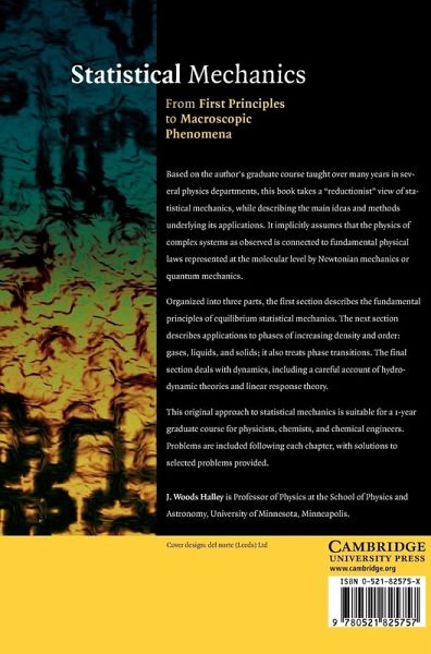 Based on the author's graduate course taught over many years in several physics departments, this 2006 book takes a 'reductionist' view of statistical mechanics, while describing the main ideas and methods underlying its applications. It implicitly assumes that the physics of complex systems as observed is connected to fundamental physical laws represented at the molecular level by Newtonian mechanics or quantum mechanics. Organised into three parts, the first section describes the fundamental principles of equilibrium statistical mechanics. The next section describes applications to phases of increasing density and order: gases, liquids and solids; it also treats phase transitions. The final section deals with dynamics, including a careful account of hydrodynamic theories and linear response theory. This textbook is suitable for a one year graduate course in statistical mechanics for physicists, chemists and chemical engineers. Problems are included following each chapter, with solutions to selected problems provided.