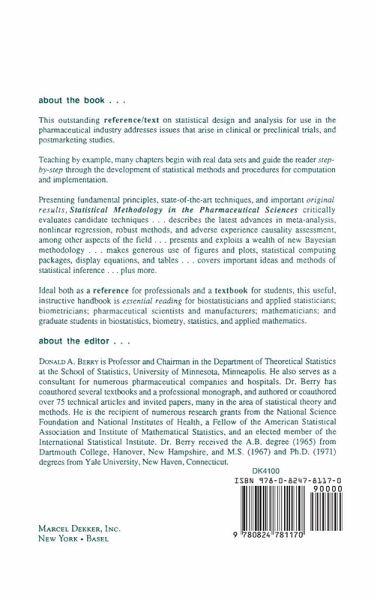 A state-of-the-art handbook of statistical analysis for use in the pharmaceutical industry. Areas covered in this reference/text include: bioavailability, repeated-measures designs, dose-response, population models, multicenter trials, handling dropouts, survival analysis, robust data analysis, cate