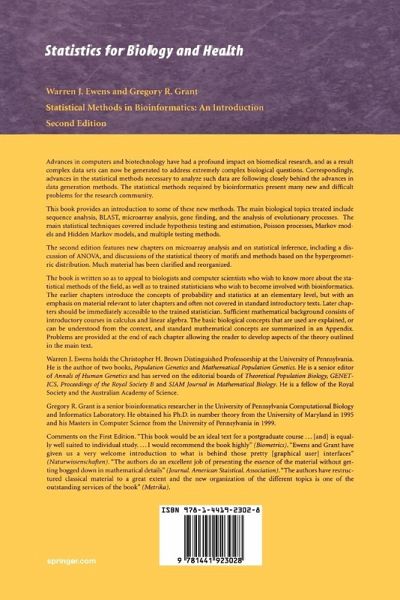 "Ewens and Grant aim to fill a gap in the literature on statistics and probability in bioinformatics. ... provides a review of the use of familiar statistical techniques and approaches to a new area. ... it provides a rigorous treatment of statistical issues associated with bioinformatics tools and a strong statement of the statistical principles and philosophy which needs to underpin these tools. It admirably meets its objectives in thisrespect and is to be recommended." (David Lovell, Pharmaceutical Statistics, Issue 6, 2007)