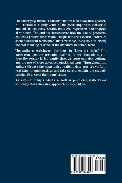 The aim of this book is to present the mathematics underlying elementary statistical methods in as simple a manner as possible. These methods include independent and paired sample t-tests, analysis of variance, regression, and the analysis of covariance. The author's principle tool is the use of geometric ideas to provide more visual insight and to make the theory accessible to a wider audience than is usually possible. TOC:From the contents: Introduction.- Paired Samples.- Independent Samples.- Several Independent Samples (Analysis of Variance).- Simple Regression.- Overview.- Appendices: Geometric Tool Kit; Statistical Tool Kit; Computing; Alternative Test Statistic; Solutions to Exercises; Statistical Tables.