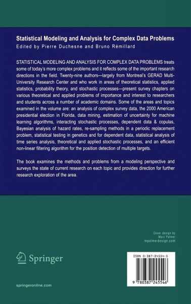 Statistical Modeling and Analysis for Complex Data Problems treats some of today's more complex problems and it reflects some of the important research directions in the field. Twenty-nine authors - largely from Montreal's GERAD Multi-University Research Center and who work in areas of theoretical statistics, applied statistics, probability theory, and stochastic processes - present survey chapters on various theoretical and applied problems of importance and interest to researchers and students across a number of academic domains.