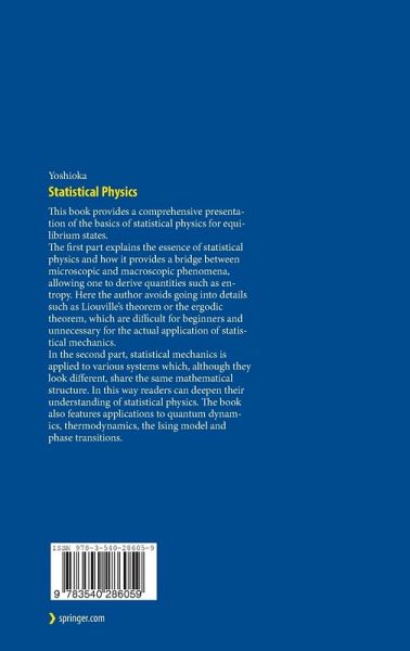 From the reviews: "Yoshioka (Univ. of Tokyo) offers an introduction to statistical physics with an emphasis on macroscopic relations. ... Yoshioka writes well, and students will derive a great deal from this text. It might work well as a course supplement of for someone who wants a good introduction to macroscopic studies. Summing Up: Recommended. Upper-division undergraduates." (E. Kincanon, CHOICE, Vol. 44 (10), June, 2007) "The book is intended as a textbook for undergraduate students, and it is divided into three parts. The first part is devoted to general principles, the second part to elementary investigators and the third part to more advanced topics. ... Finally, the appendix summarizes some mathematical facts used in this book." (Christina Papenfuß, Zentralblatt MATH, Vol. 1129 (7), 2008) "This accessible text provides a comprehensive and self-contained introduction to the basics of statistical physics for equilibrium states at a level suitable for beginning undergraduate students with no pre-knowledge of statistical physics. ... The beginning student will appreciate the clear and lucid presentation of the subjects discussed. At the end of each chapter problems are given. The book may also serve as a useful guide for teachers of statistical physics." (Oliver Rudolph, Mathematical Reviews, Issue 2009 d)