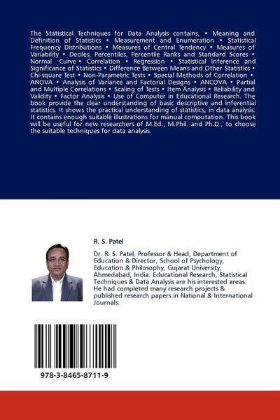 The Statistical Techniques for Data Analysis contains, Meaning and Definition of Statistics Measurement and Enumeration Statistical Frequency Distributions Measures of Central Tendency Measures of Variability Deciles, Percentiles, Percentile Ranks and Standard Scores Normal Curve Correlation Regression Statistical Inference and Significance of Statistics Difference Between Means and Other Statistics Chi-square Test Non-Parametric Tests Special Methods of Correlation ANOVA Analysis of Variance and Factorial Designs ANCOVA Partial and Multiple Correlations Scaling of Tests Item Analysis Reliability and Validity Factor Analysis Use of Computer in Educational Research. The book provide the clear understanding of basic descriptive and inferential statistics. It shows the practical understanding of statistics, in data analysis. It contains enough suitable illustrations for manual computation. This book will be useful for new researchers of M.Ed., M.Phil. and Ph.D., to choose the suitable techniques for data analysis.