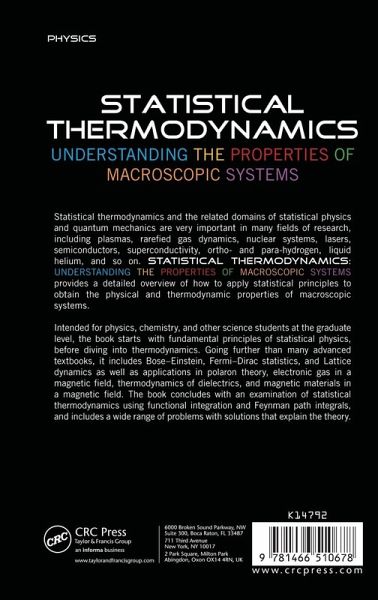 Statistical thermodynamics and the related domains of statistical physics and quantum mechanics are very important in many fields of research, including plasmas, rarefied gas dynamics, nuclear systems, lasers, semiconductors, superconductivity, ortho- and para-hydrogen, liquid helium, and so on. Statistical Thermodynamics: Understanding the Properties of Macroscopic Systems provides a detailed overview of how to apply statistical principles to obtain the physical and thermodynamic properties of macroscopic systems. Intended for physics, chemistry, and other science students at the graduate level, the book starts with fundamental principles of statistical physics, before diving into thermodynamics. Going further than many advanced textbooks, it includes Bose-Einstein, Fermi-Dirac statistics, and Lattice dynamics as well as applications in polaron theory, electronic gas in a magnetic field, thermodynamics of dielectrics, and magnetic materials in a magnetic field. The book concludes with an examination of statistical thermodynamics using functional integration and Feynman path integrals, and includes a wide range of problems with solutions that explain the theory.