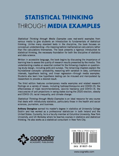 Statistical Thinking through Media Examples uses real-world examples from various media to give students an introduction to fundamentals of statistical thinking. Unlike many standard texts in the discipline, the book focuses on conceptual understanding-the meaning behind mathematical calculations rather than the calculations themselves. The book presents a rigorous introduction to statistical thinking, the necessary foundation for both the discipline of statistics and data science. Written in accessible language, the book begins by discussing the importance of learning how to assess the quality of research results presented by the media. This understanding creates an essential context for the following chapters on questioning study design, including polls and surveys. The remaining chapters explain the foundational concepts-probability, reasoning with variation in data, confidence intervals, hypothesis testing, and linear regression-through media examples. Students also learn how hypothesis testing can be misused and manipulated by researchers to provide a desired result. The third edition features contemporary media examples and related research findings on a variety of issues, including hydroxychloroquine and COVID-19, the effectiveness of mask recommendations, vaccine hesitancy and COVID-19, the inaccuracies of poll projections in swing states during the 2020 election, obesity and COVID-19, racial inequality, and climate change. Statistical Thinking through Media Examples is an ideal resource for any course that deals with introductory statistics, particularly those in the health and social sciences, journalism, and business.