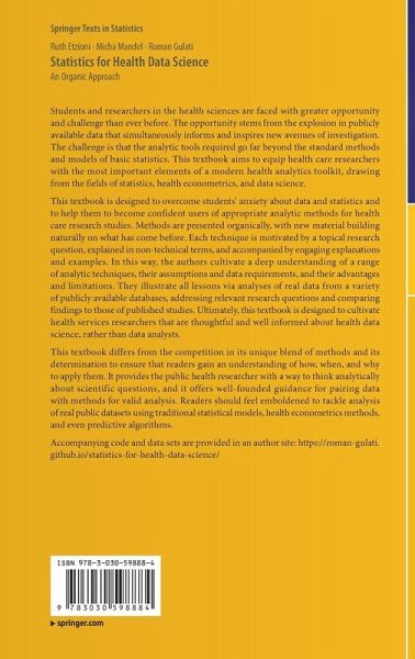 This textbook is designed to overcome students' anxiety about data and statistics and to help them to become confident users of appropriate analytic methods for health care research studies. Methods are presented organically, with new material building naturally on what has come before. Each technique is motivated by a topical research question, explained in non-technical terms, and accompanied by engagingexplanations and examples. In this way, the authors cultivate a deep ("organic") understanding of a range of analytic techniques, their assumptions and data requirements, and their advantages and limitations. They illustrate all lessons via analyses of real data from a variety of publicly available databases, addressing relevant research questions and comparing findings to those of published studies. Ultimately, this textbook is designed to cultivate health services researchers that are thoughtful and well informed about health data science, rather than data analysts.
