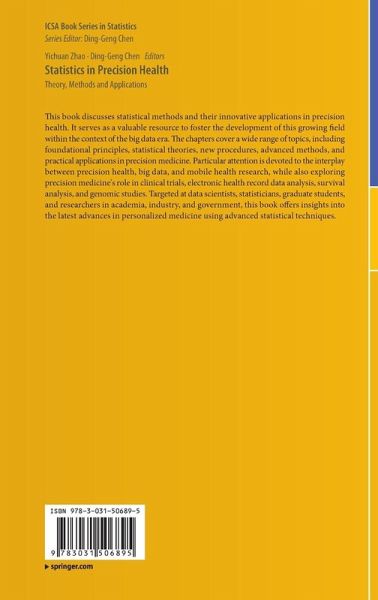 This book discusses statistical methods and their innovative applications in precision health. It serves as a valuable resource to foster the development of this growing field within the context of the big data era. The chapters cover a wide range of topics, including foundational principles, statistical theories, new procedures, advanced methods, and practical applications in precision medicine. Particular attention is devoted to the interplay between precision health, big data, and mobile health research, while also exploring precision medicine's role in clinical trials, electronic health record data analysis, survival analysis, and genomic studies. Targeted at data scientists, statisticians, graduate students, and researchers in academia, industry, and government, this book offers insights into the latest advances in personalized medicine using advanced statistical techniques.