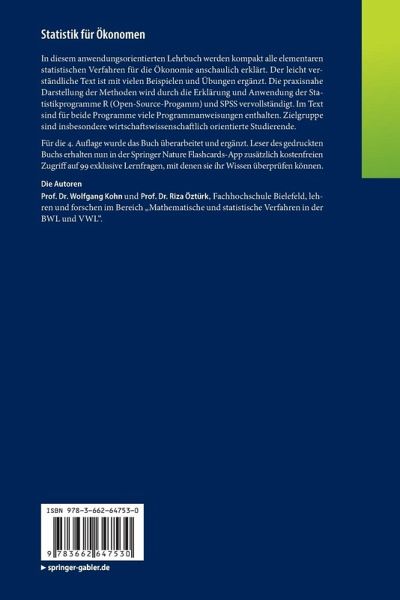 In diesem anwendungsorientierten Lehrbuch werden kompakt alle elementaren statistischen Verfahren für die Ökonomie anschaulich erklärt. Der leicht verständliche Text ist mit vielen Beispielen und Übungen ergänzt. Die praxisnahe Darstellung der Methoden wird durch die Erklärung und Anwendung der Statistikprogramme R (Open-Source-Progamm) und SPSS vervollständigt. Im Text sind für beide Programme viele Programmanweisungen enthalten. Zielgruppe sind insbesondere wirtschaftswissenschaftlich orientierte Studierende.