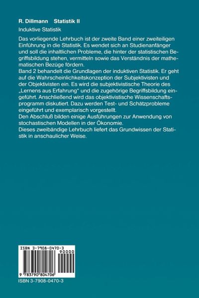 Das vorliegende Lehrbuch ist der 2. Band einer 2-teiligen Einführung in die Statistik. Es wendet sich an Studienanfänger und soll die inhaltlichen Probleme, die hinter der statistischen Begriffsbildung stehen, vermitteln und das Verständnis der mathematischen Bezüge fördern. Band 2 behandelt die Grundlagen der induktiven Statistik. Er geht auf die Wahrscheinlichkeitskonzeption der Subjektivisten und der Objektivisten ein. Neben Beispielen für parametrische Klassen werden auch das Konzept suffizienter Statistiken, natürlich konjugierte a-priori-Verteilungen und objektivistische Testtheorien in verständlicher Weise erläutert. Abschließend behandelt der Band das Schätzproblem, Modelle in der Ökonomie sowie verallgemeinerte lineare Modelle. Dieses 2-bändige Lehrbuch liefert das Grundwissen der Statistik in anschaulicher Weise.
