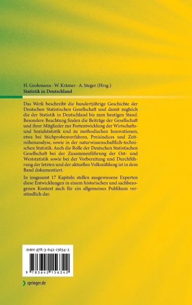 Teil I Die Deutsche Statistische Gesellschaft im Wandel der Zeit: Wie alles begann (Almut Steger).- Die Deutsche Statistische Gesellschaft in der Weimarer Republik und während der Nazidiktatur (Jürgen Wilke).- Wiederbeginn nach dem Zweiten Weltkrieg (Heinrich Strecker, Rosemarie Bassenge-Strecker).- Neuausrichtung und Konsolidierung (Heinz Grohmann).- Wege in die Zukunft (Göran Kauermann, Karl Mosler).- Das Allgemeine Statistische Archiv (Horst Rinne).- Teil II Ausgewählte Arbeitsfelder in der Gegenwart: Ausbildung als zentrale Aufgabe (Walter Krämer, Sibylle Schmerbach).- Methodik und Qualität statistischer Erhebungen (Walter Krug, Jürgen Schmidt, Rolf Wiegert).- Unternehmens- und Marktstatistik (Michael Grömling, Ulrich Scheinost).- Regionalstatistik (Helmut Eppmann, Michael Fürnohr).- Statistik in Naturwissenschaft und Technik (Peter-Theodor Wilrich).- Mikrodaten und statistische Auswertungsmethoden (Reinhard Hujer).- Ökonometrie (Joachim Frohn).- Zeitreihenanalyse (Philipp Sibbertsen).- Preisstatistik (Hans Wolfgang Brachinger).- Teil III Die Deutsche Statistische Gesellschaft und die Politik: Herausforderungen durch die deutsche Wiedervereinigung (Reiner Stäglin).- Volkszählung und Mikrozensus (Heinz Grohmann).- Anhänge.