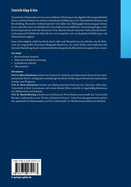 Das Lehrbuch umfasst die zentralen Aspekte der Beschreibenden und der Schließenden Statistik und betont die inhaltlichen Bezüge zwischen beiden Bereichen. Schwerpunkte werden in den Bereichen der Stichprobenziehung sowie der Abhängigkeitsmessung gelegt, da diese Themengebiete sehr starke grundlegende Relevanz für die Praxis sowohl in beruflichen als auch wissenschaftlichen Fragestellungen aufweisen. Deshalb wird auch die multiple lineare Regression diskutiert und mit der anschließenden Skizzierung des multiplen Linearen Modells ein Ausblick auf die Ökonometrie gegeben.