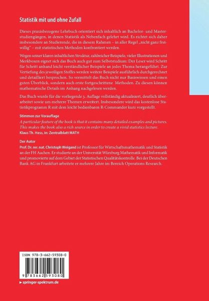 Das Buch wurde für die vorliegende 3. Auflage vollständig aktualisiert, deutlich überarbeitet sowie um mehrereThemen erweitert. Insbesondere wird das kostenlose Statistikprogramm R mit dem leicht bedienbaren R-Commander kurz vorgestellt.