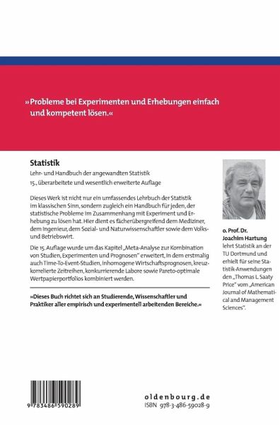 Dieses Werk ist nicht nur ein umfassendes Lehrbuch der Statistik im klassischen Sinn, sondern zugleich ein Handbuch für jeden, der statistische Probleme im Zusammenhang mit Experiment und Erhebung zu lösen hat. Hier dient es fächerübergreifend dem Mediziner, dem Ingenieur, dem Sozial- und Naturwissenschaftler sowie dem Volks- und Betriebswirt. Die 15. Auflage wurde um das Kapitel "Meta-Analyse zur Kombination von Studien, Experimenten und Prognosen" erweitert, in dem erstmalig auch Time-To-Event-Studien, inhomogene Wirtschaftsprognosen, kreuzkorrelierte Zeitreihen, konkurrierende Labore sowie Pareto-optimale Wertpapierportfolios kombiniert werden.