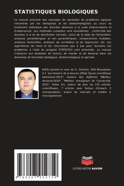 Le manuel présente des exemples de résolution de problèmes typiques rencontrés par les biologistes et les biotechnologistes au cours du traitement statistique des données obtenues à la suite d'observations et d'expériences. Les méthodes suivantes sont considérées : conformité des données à la loi de distribution normale, calcul de la taille de l'échantillon, analyses paramétriques et non paramétriques, comparaisons multiples, analyses factorielles, analyses de corrélation et de régression, etc. Les algorithmes de choix et les instructions pas à pas pour résoudre ces problèmes à l'aide du progiciel STATISTICA sont présentés. Le manuel s'adresse aux étudiants de licence, de master et de doctorat dans les domaines de formation biologique, biotechnologique et agricole.