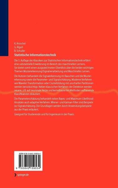 Die 5. Auflage des Klassikers zur Statistischen Informationstechnik erfährt eine substantielle Erweiterung im Bereich des maschinellen Lernens. Sie bietet somit einen ausgezeichneten Überblick über die beiden wichtigen Themen Mustererkennung/Signalverarbeitung und Maschinelles Lernen.