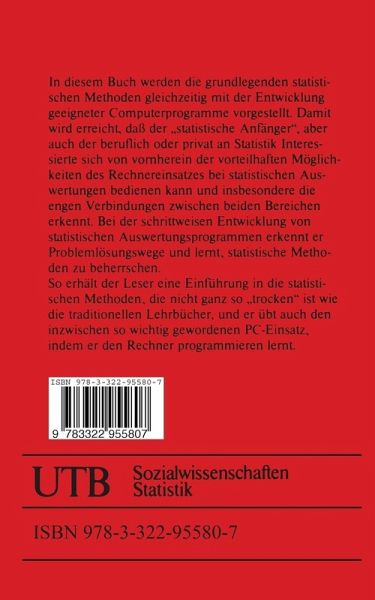 Kap. 1: Wozu dient dieses Buch?.- Kap. 2: Grundbegriffe der Statistik und der Datenverarbeitung.- Kap. 3: Vorbereitung der Computereinsatzes.- Kap. 4: Die Eingabe von Daten.- Kap. 5: Die Ausgabe statistischer Tabellen.- Kap. 6: Graphische Darstellungen.- Kap. 7: Mittelwerte und Streuungsmaße.- Kap. 8: Regressions- und Korrelationsrechnung.- Kap. 9: Zeitreihenstatistik.- Kap. 10: Ausblick.- Anhänge.- A1 BASIC-Anweisungen.- A2 BASIC-Kommandos.- A3 BASIC-Funktionen.- A4 Wichtige Regeln der Programmiersprache BASIC.- A5 Wichtige Fehlermeldungen.- A6 Korrigieren.- A7 Wichtige EDV-Stichworte.- A8 Literaturverzeichnis.- A9 Stichwortverzeichnis.